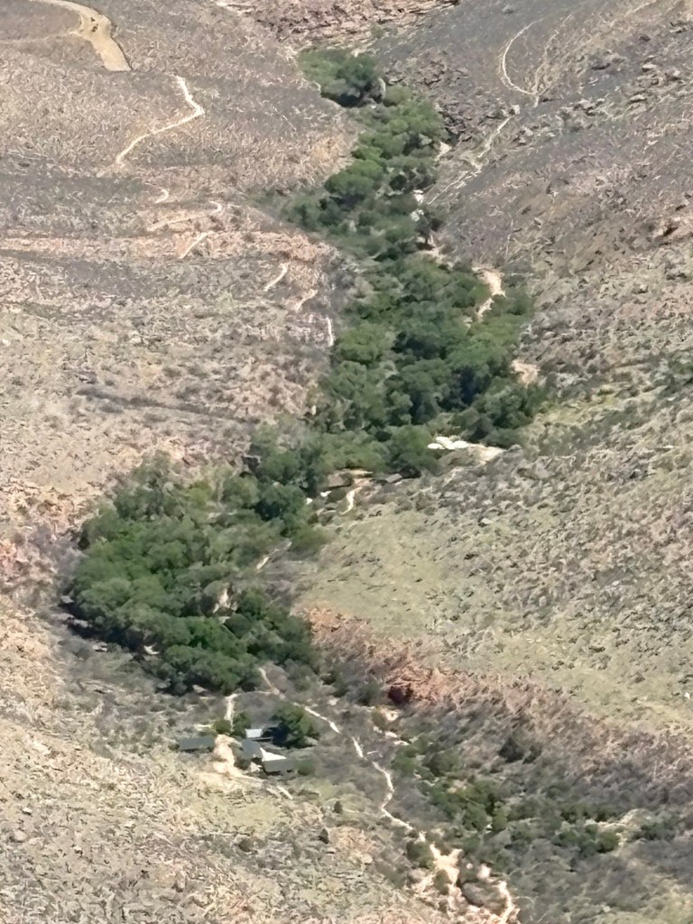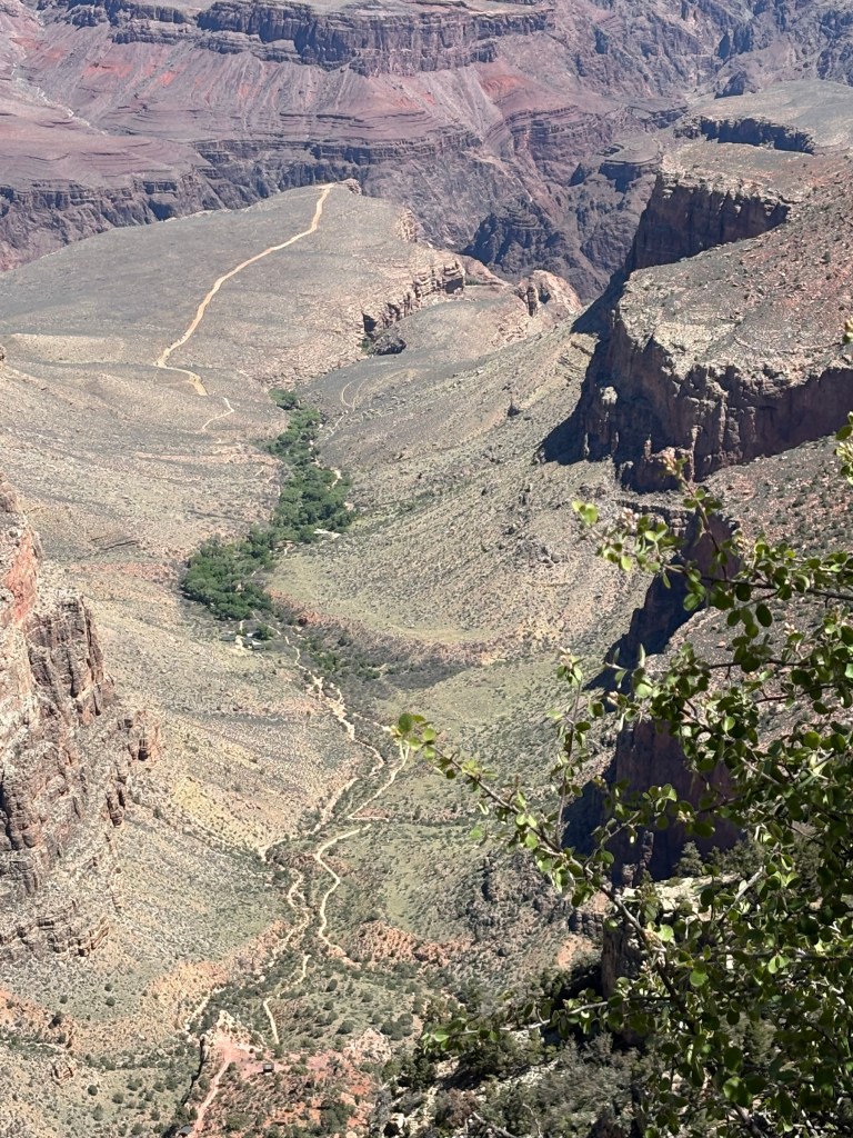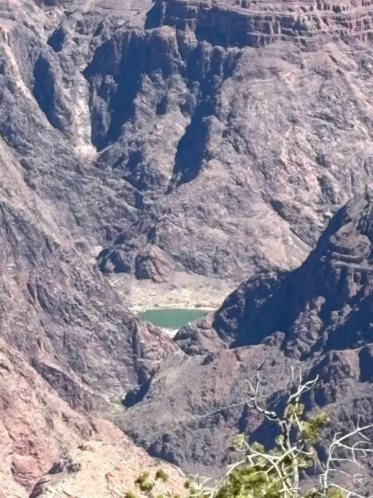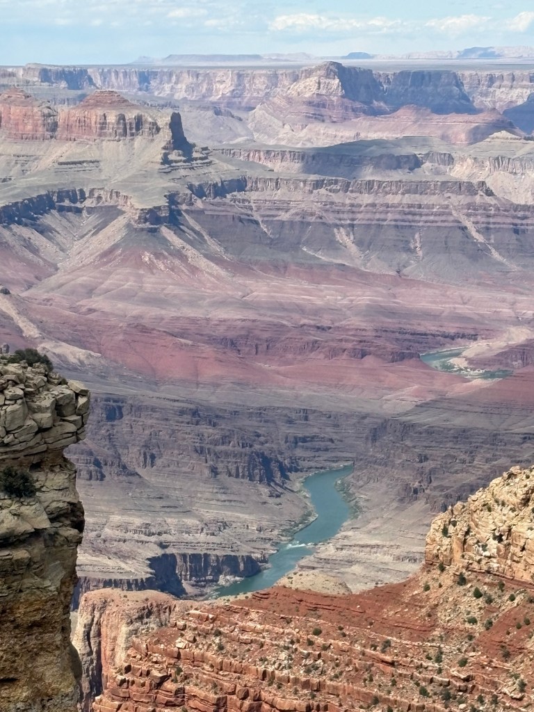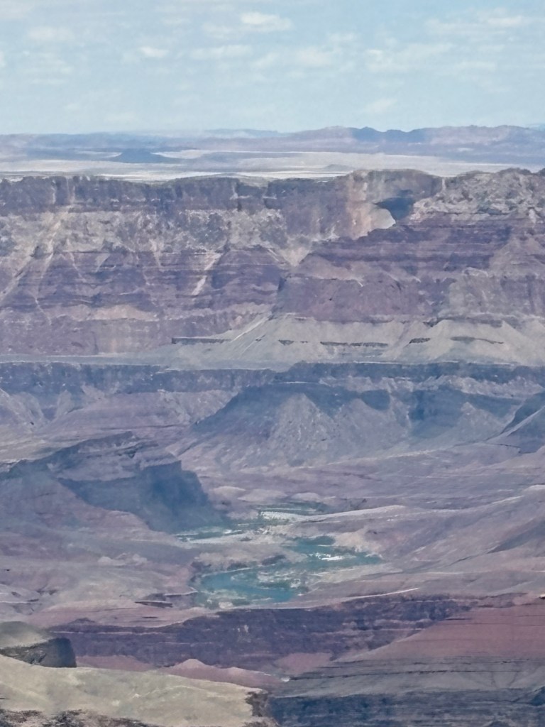 On a clear day you can easily see Mount Trumbull just above the western horizon, 62 miles (99 km) away. Most days, haze makes spotting this distant landmark difficult. Sadly, most of this haze is human-caused. It can be a plume from a local forest fire, but usually haze is pollution from urban and industrial areas hundreds of miles to the south and west, and even from Asia.