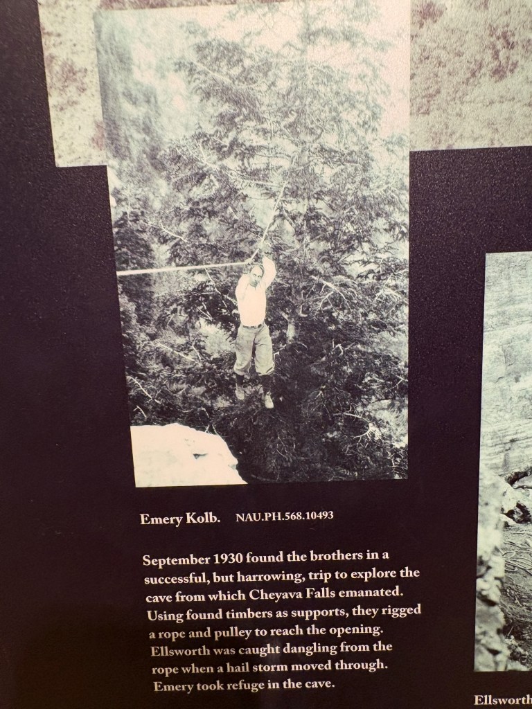September 1930 found the brothers in a successful, but harrowing, trip to explore the cave from which Cheyava Falls emanated. Using found timbers as supports, they rigged a rope and pulley to reach the opening. Ellsworth was caught dangling from the rope when a hail storm moved through. Emery took refuge in the cave.