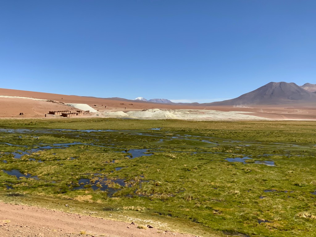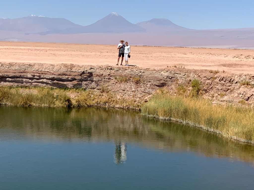03:00 pm We arrived at the Salar to find a line up of some length so Nicholas suggested we go to the Ojos de Salar first which worked out well. These sites are managed by the local native tribe. We visited the Ojos de Salar, formed by two water pools coming from subway layers where small reeds and algae grow on its banks.