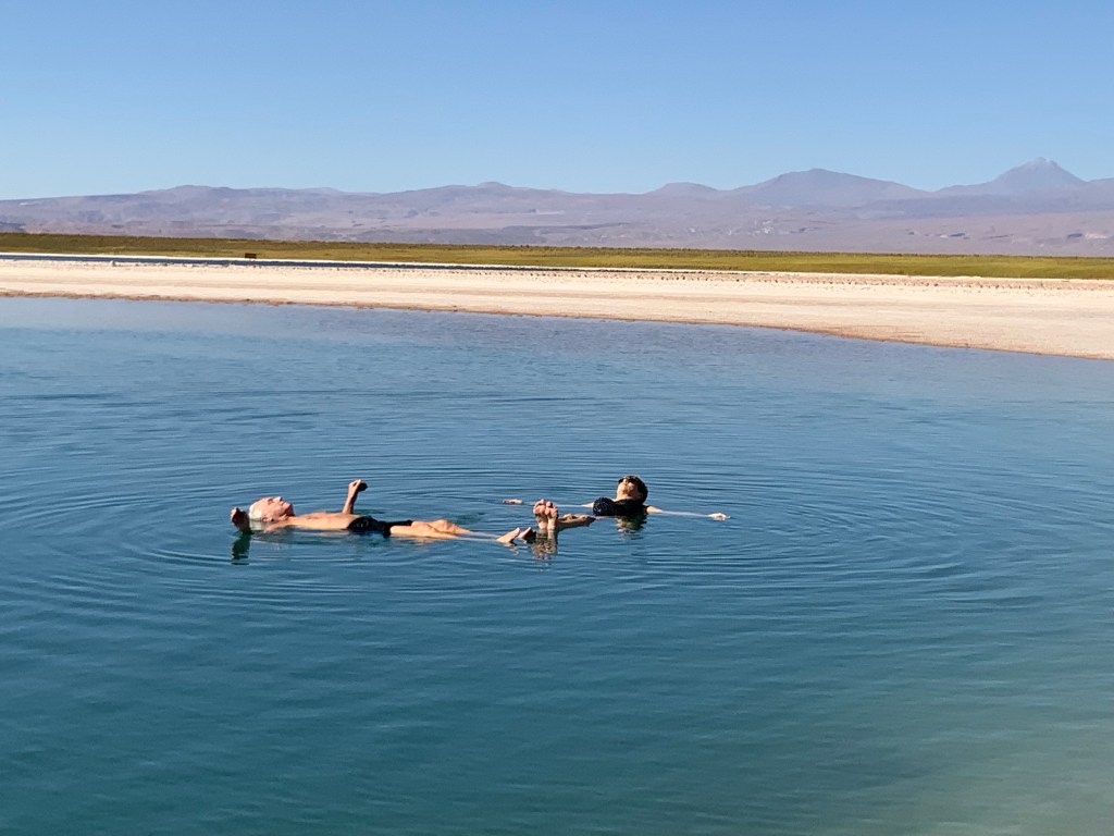 The Salar de Atacama is the largest salt deposit in Chile and it is formed by a depression with no exit for the water that it receives from the San Pedro river and multiple streams through which the water filters from the mountain range. Inside this, we found the Cejar Lagoon, beautiful and mystical with a turquoise color. Its high salt content generates the effect of floating, and in fact it is difficult to swim and stay upright – you feel like a cork bobbing up and down. It was a lovely sensation.