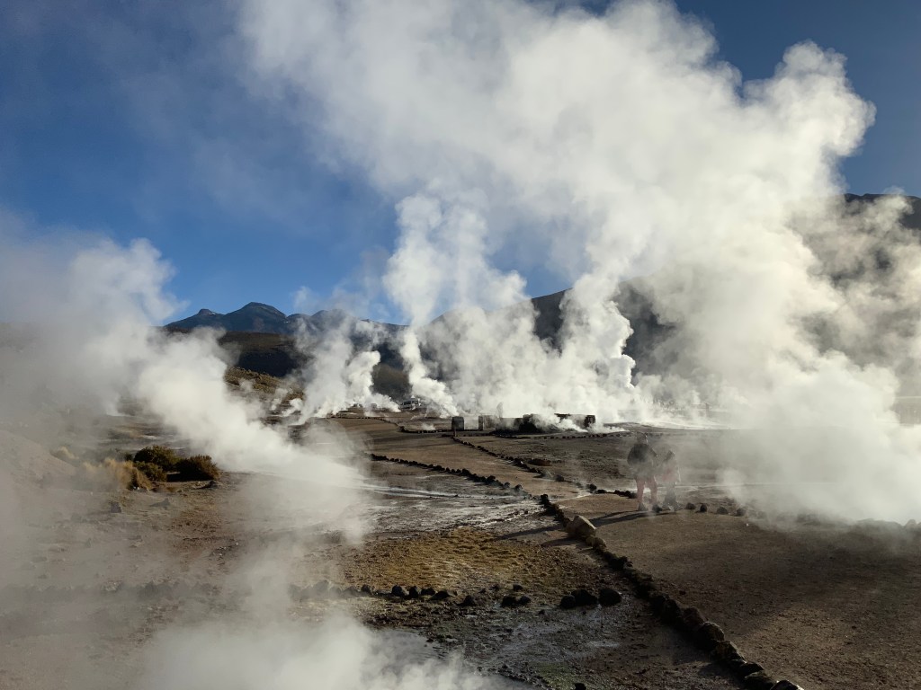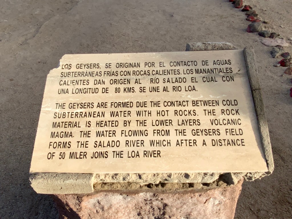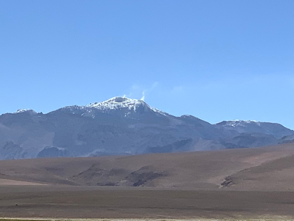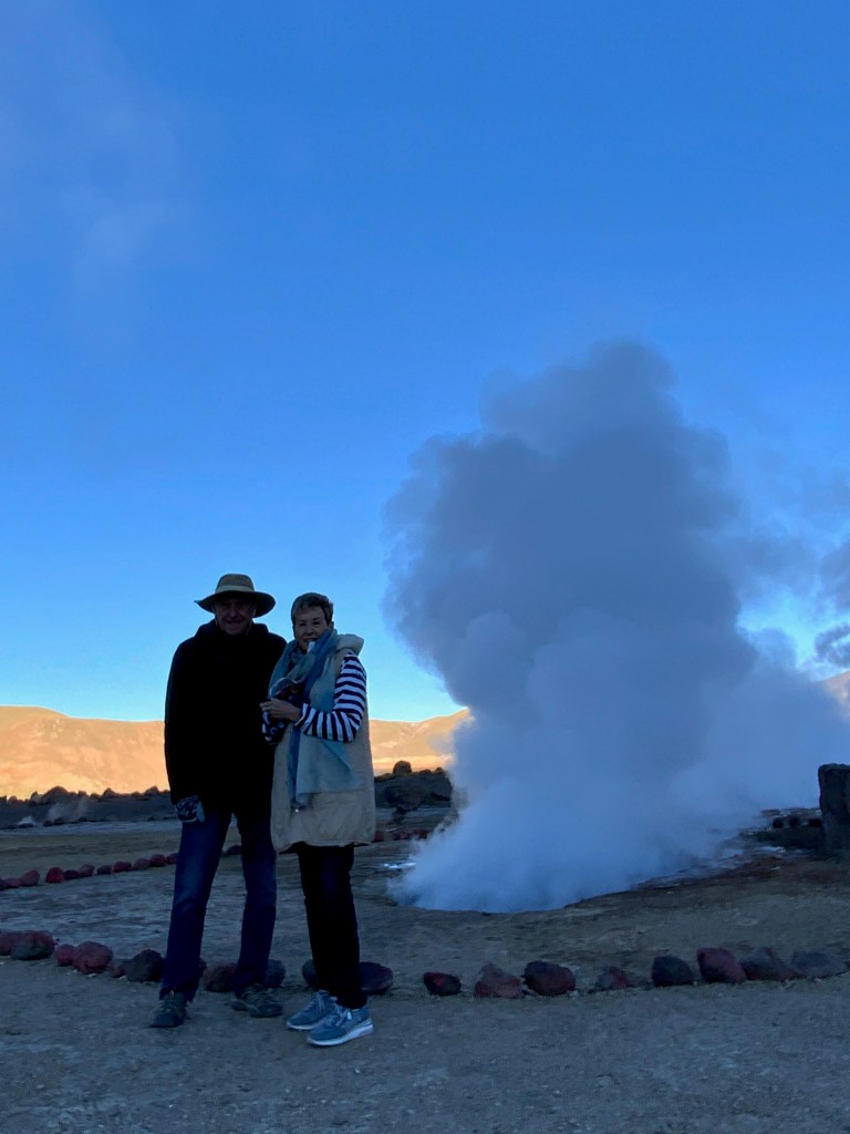 We travelled bumpy, unfinished narrow roads for an hour an a half to visit one of the highest geyser fields in the world. Luis is a very careful and capable driver and even Bill who is a terrible passenger felt very safe. Located in the Andes Mountains, 61 miles from San Pedro de Atacama and 4,320 meters above sea level, El Tatio (from Kunza “tata-iu”) means “The Grandfather Who Cries.” It is the largest group of geysers in the southern hemisphere and the third-largest in the world, after Yellowstone (USA) and Dolina Giezerow (Russia). At dawn, with freezing temperatures, you can see a fantastic spectacle, generated by violent steam flows that rise up to 10 meters high with temperatures reaching 85°C.
