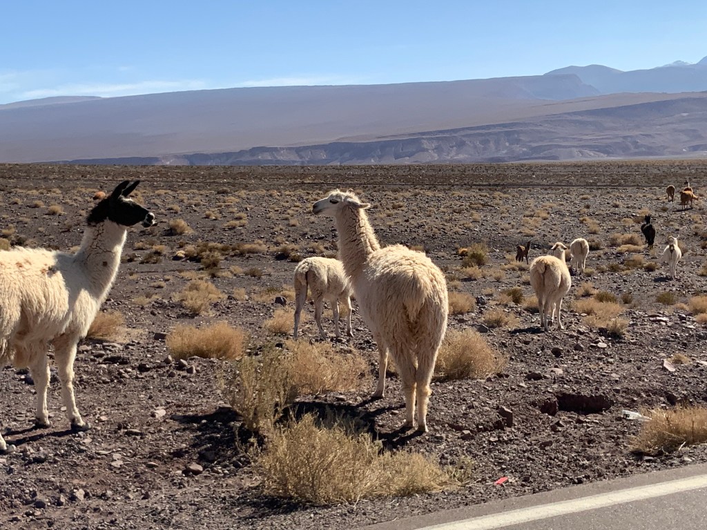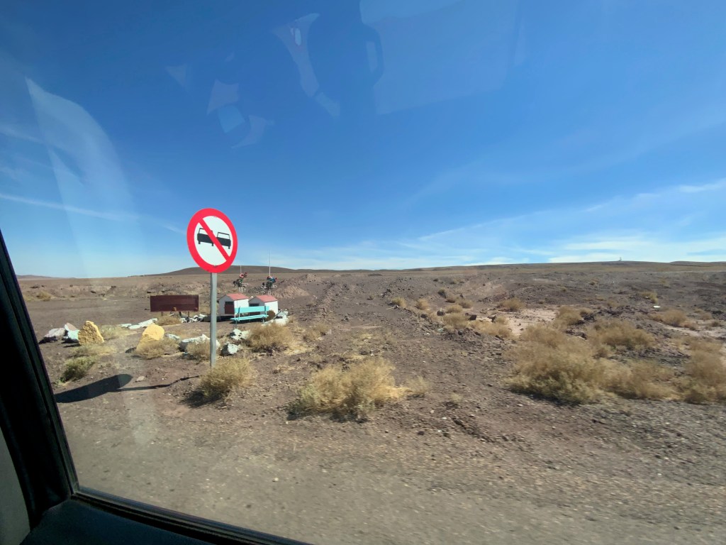 Another long trip through the desert to Calama airport passing many ‘hermitages’ on the highway. These were small buildings created to house the a part of the soul of the person who died accidentally on the highway which was believed to remain at the site.