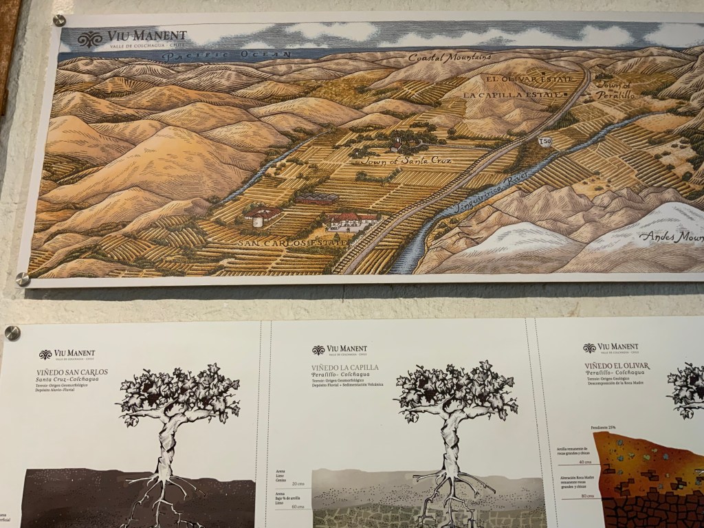This winery was founded in 1935 and today known as a Chilean excellence winery, exporting to 30 countries in the world and producing fine wines only with their own grapes. After a walk around the old residence, our guide, Lia, gave us a history of the winery which started when Mr Viu started as a bottling wine production, moved on to the purchase of the San Carlos winery and became Viu Manent when he married his wife. Over the years, more properties were purchased closer to the mountains and additional varieties added to now include 14 varieties.