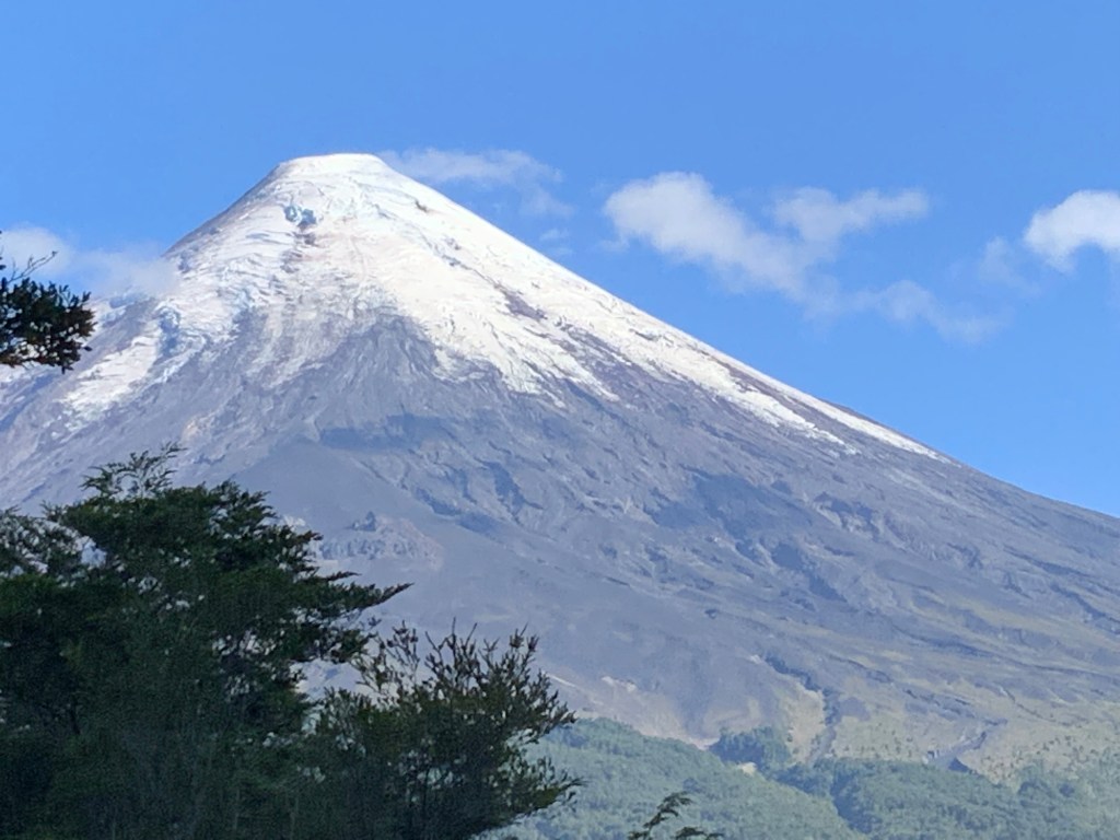 The volcanos are a constant presence. Osorno, altitude 2662 m. located by Lake Llanquihue Lake, inactive for more than a century and used by skiers and for snow sports.
