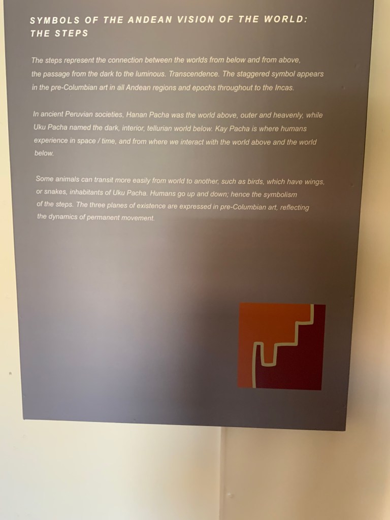 One of the common symbols in pre-Columbian art in all regions is that of steps that represent the connection between the worlds above and below, the passage from dark to luminous. Hanan Pacha was the world above, outer and heavenly while Uku Pacha named the dark, interior world below. Kay Pacha is where humans experience in space/time and from where we interact with the world above and the world below. Some animals can transit more easily from one world to another, such as birds which have wings or snakes, inhabitants of Uku Pacha. Humans go up and down; hence the symbolism of the steps.