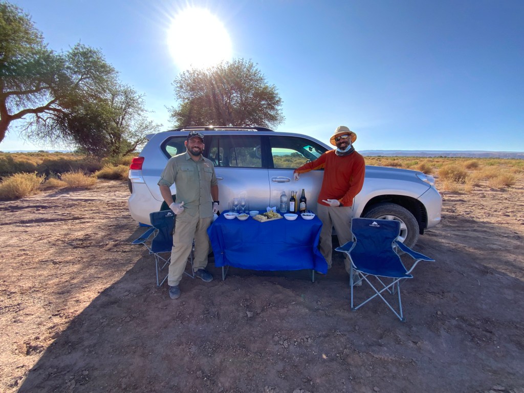Later, we had a picnic lunch prepared by Nicholas and Luis in the desert under a tree and in the reflection of the mountain range. An unforgettable spectacle.