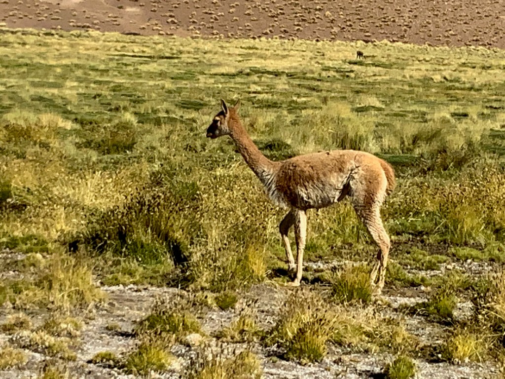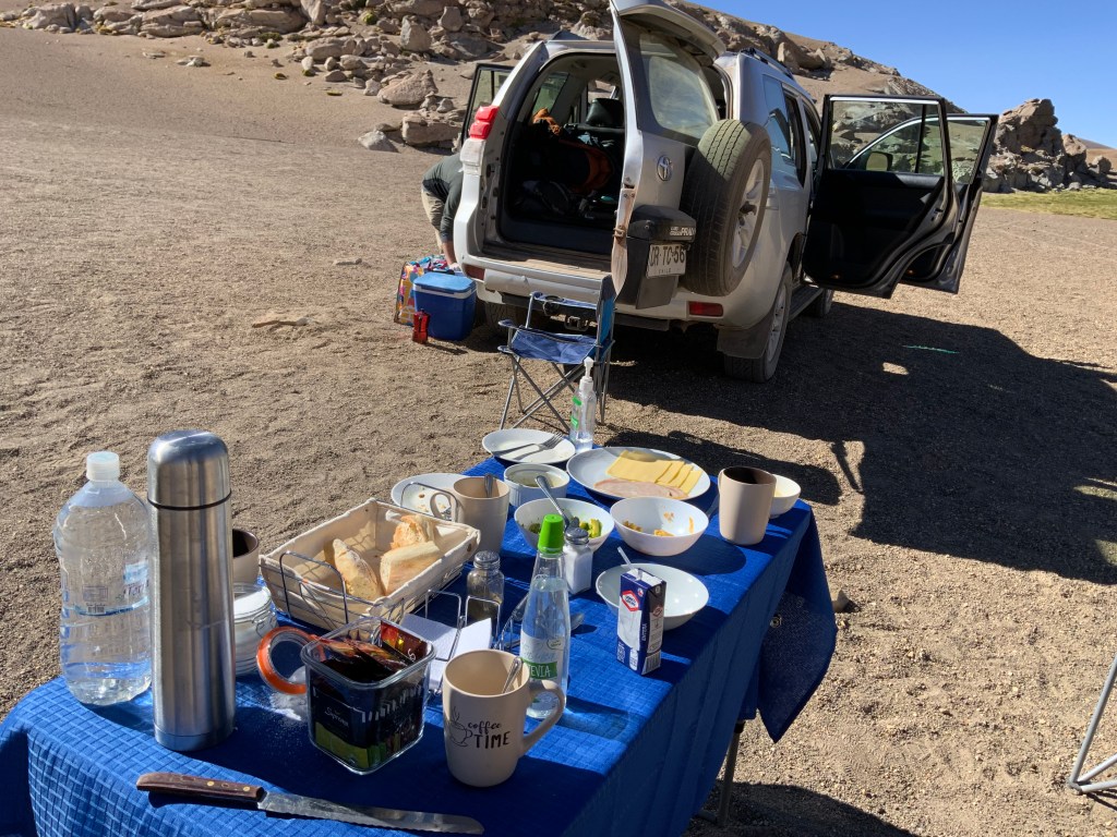 We then had a picnic on one of the valleys off the main road where Luis and Nicholas served a breakfast of eggs, bacon (cooked on a portable single burner propane stove) with a fresh bagette, ham, cheese, jam, cookies and fresh-brewed coffee. The vicuñas (wild predecesors of the domesticated lamas) joined us and seemed to care little about what we were doing.