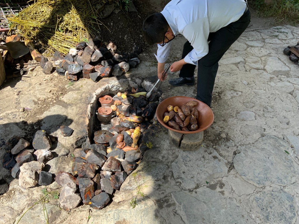 The women dressed in traditional dress met us with a song and then demonstrated traditional agricultural and food preservation methods such as drying potatoes.