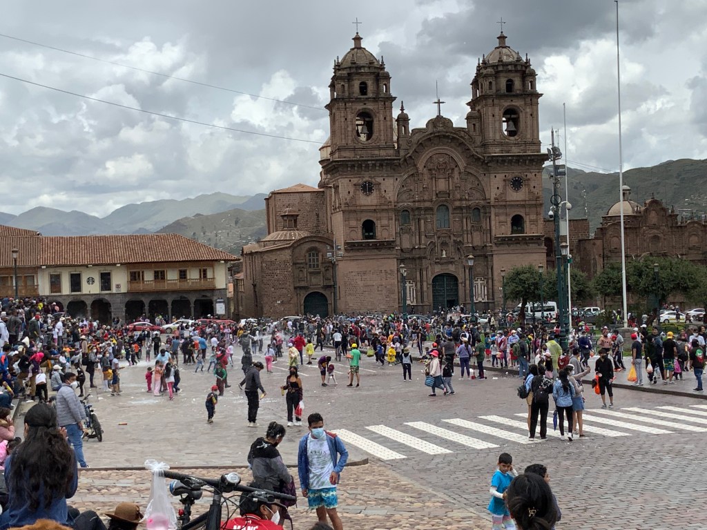 In the morning, we walked in the sun to the Plaza de Armas to find crowds of people celebrating Carnivale. We managed to avoid getting sprayed by mostly youngsters and teenagers with cans of soap spray and water bombs. They were having fun and getting totally soaked. The air was white with the flying spray. We were looking for a restaurant for lunch but decided it was too risky to stay around.