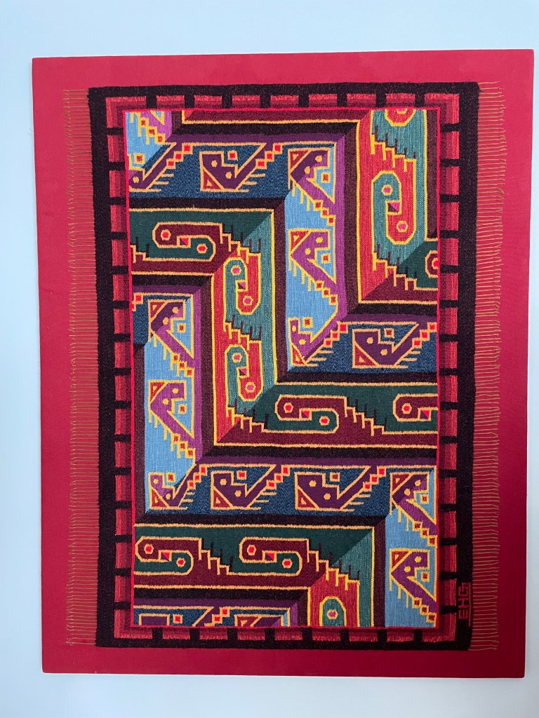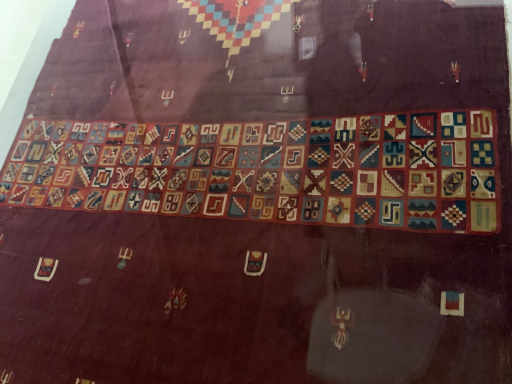 We stopped at Sulca Textiles recommended by Marissa, where the guide walked us through the spinning, dying, weaving process and showed us traditional tapestries. We bought a beautiful mainly blue and red one using traditional designs: