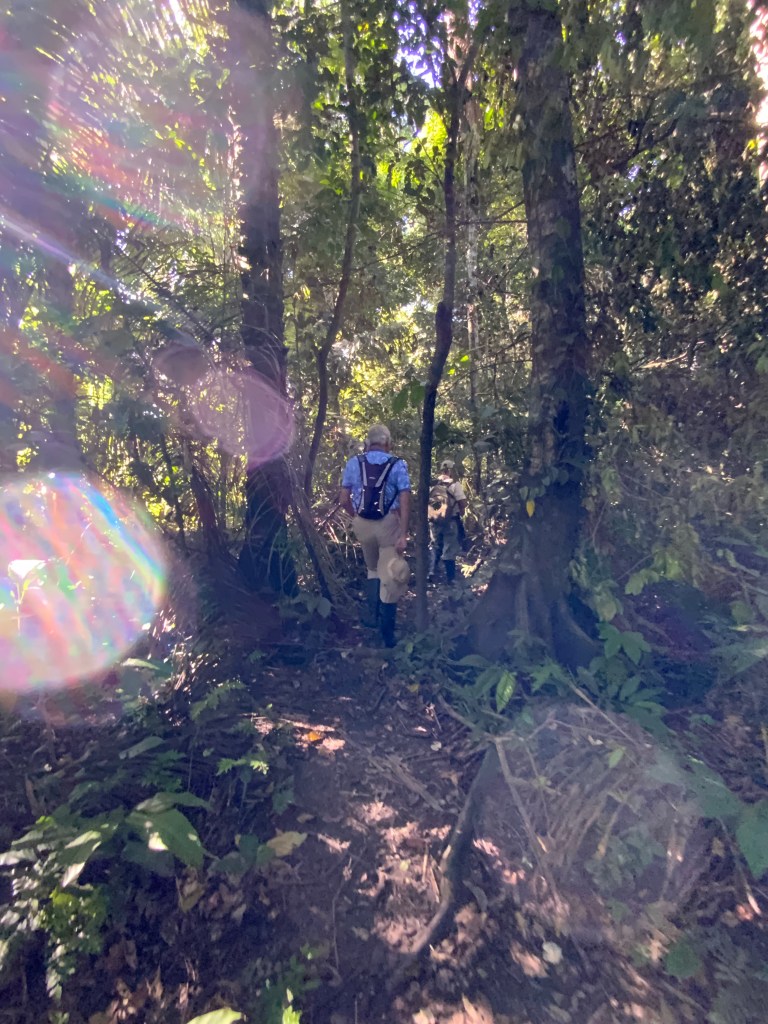 After we arrived at the lodge and a moment to settle in, we enjoyed a delicious lunch and chilled juices; then we set out on a guided walk with Paulo and the group of Andy from Saskatchewan, Camille, Agathe, and Valentine from Paris, France along one of the many beautiful trails. This was a good introduction to the Amazon Rainforest – hot, humid and buggy.