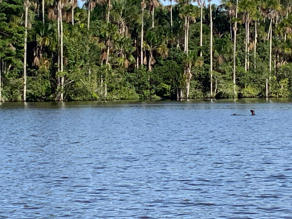 After a 7 km hike, we climbed into a wooden canoe went along a narrow river and then across a beautiful, mirror-like lake that is home to the endangered giant river otter.