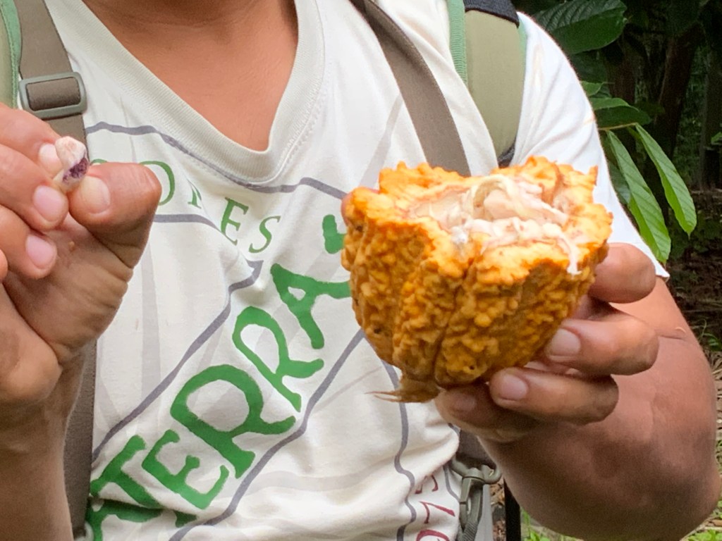 Paulo showed us various fruits growing in the model farm such as cocao.