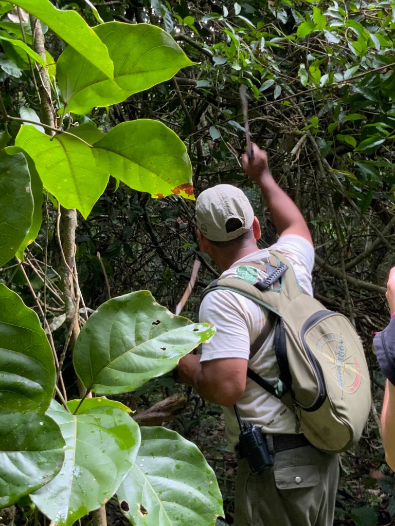 After a 25-minute boat trip up the river, we arrived at the Inkaterra Hacienda Conception Nature and Wildlife Center. The centre is used as a model farm to teach the locals ways to crop rotate and land management. It was a very hot humid and buggy day with the mosquitos swarming around our group of 7 (Paulo, us, Camille, Valentine, Agathe and Andy) as we stomped through the jungle and Paulo hacked the vines with his machete.